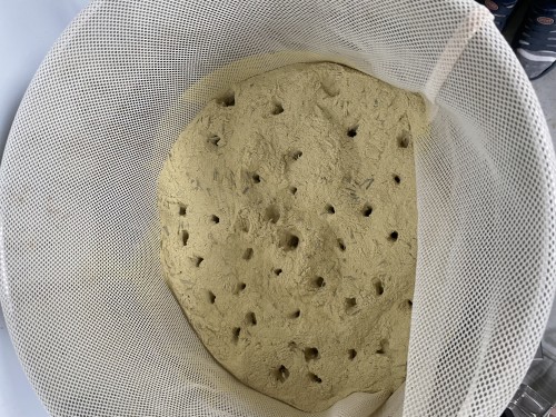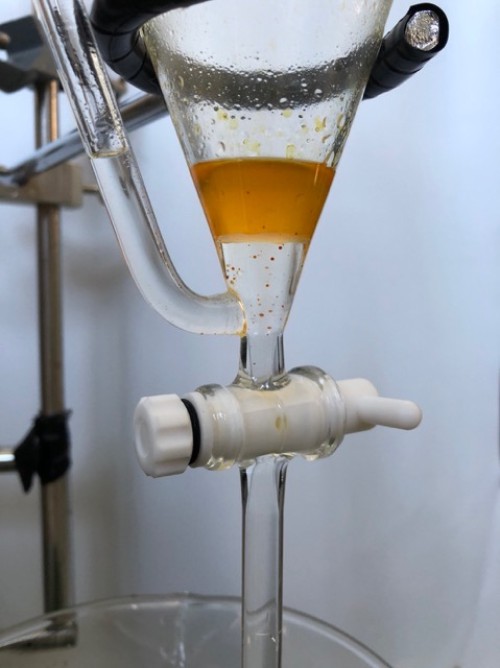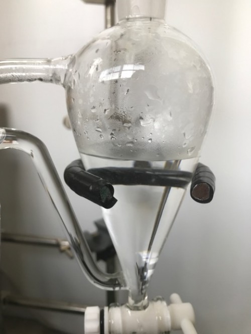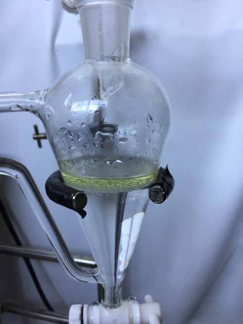 ホップ粉末(26年度分)の蒸留。生の時と同じ25Lとロングオイルセパレーター使用。粉末の場合、菜箸やお玉の柄などで蒸気が通りやすいよう蒸気穴をあけておく。に黄色いオイルが確認できるが採取困難。ウォーターは良い香り。
