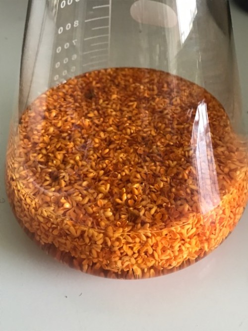 珍しい生のホップの蒸留です。ビールの原料としておなじみのホップ。毬花(キュウカ)を細かくしてスチーム蒸留です。精油はオレンジ色・蒸留水も黄色の色があり、精油の香りはビール?の香り。