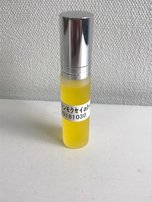 キンモクセイのabs(アブソリュート)です。キンモクセイの香りは蒸留では採る事が出来ません。ヘキサンなどの溶剤に漬けてから採取する事が出来ます。ヘキサンに漬けこみ、香り成分をヘキサンにうつし、固形物を除去してヘキサン溶液を作る。エバポレーターでヘキサン除去しエタノールを加えて-20℃に冷却、ワックス質を析出させた後、ワックス質をろ過・除去した後再度、エバポレーターでエタノール除去しabsアブソリュートの完成。