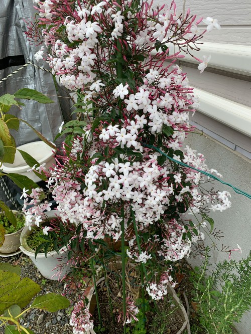 4月から5月にかけて開花したジャスミン を収穫し、5回に渡って、大型ソックスレー抽出器で抽出しました。 それでも花は軽いので合計で450g。 ヘキサン溶液(コンクリート)→ ロータリーエバポレーターによるヘキサン除去 → エタノール 添加、ワックス(蝋成分)除去(濾過) → ロータリーエバポレーターによるエタノール 除去 → ジャスミン abs. 完成!! これらの工程を経て、ジャスミン abs. 2.2046g(from 花450g, 抽出率0.49%) が採れました!
