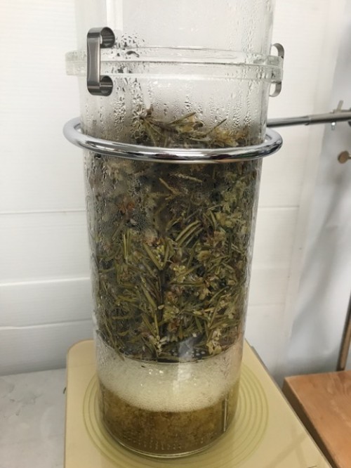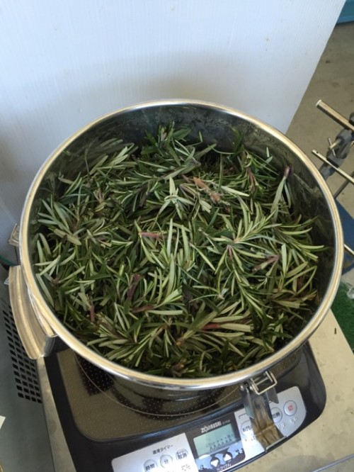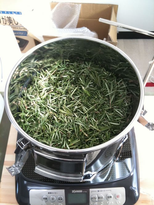 会社のローズマリー 剪定で切った枝葉をIH仕様で水蒸気蒸留。加水は 600ml。