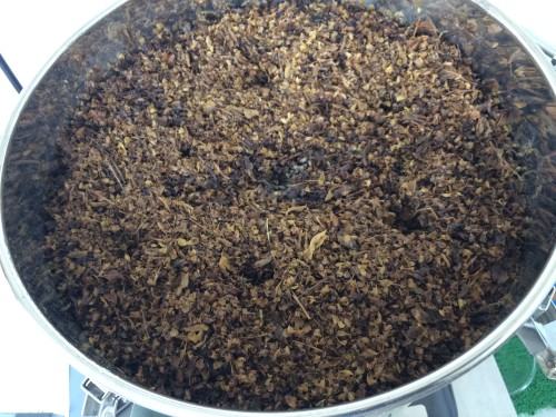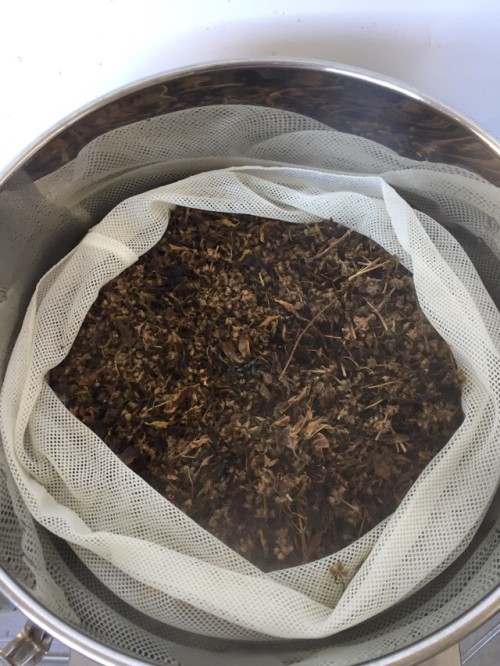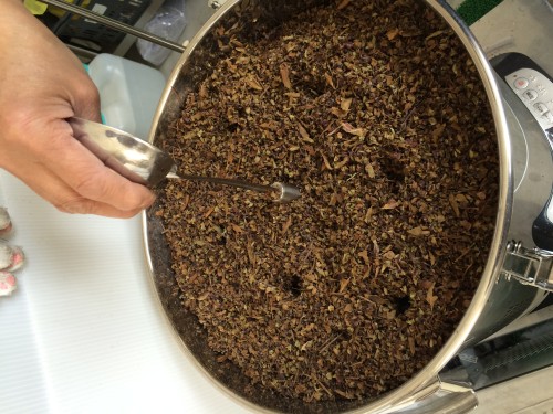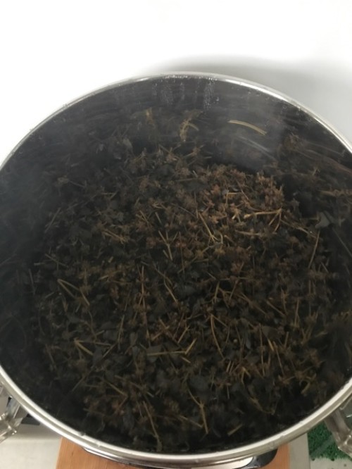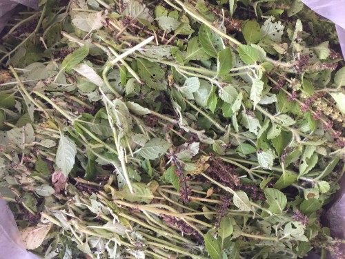 前日に到着したホーリーバジル(フレッシュ)。2日前に送付されたようでビニール袋に入れてあった為フレッシュなので蒸れて少し傷みもあった。到着後、広げて保管した。手にとると葉が落ちて茎だけになってしまう。葉と穂先をカットして蒸留釜へ3,660gで満タン。
