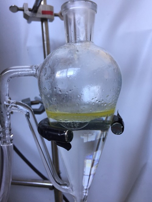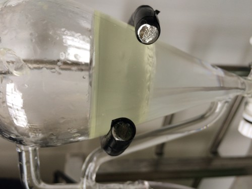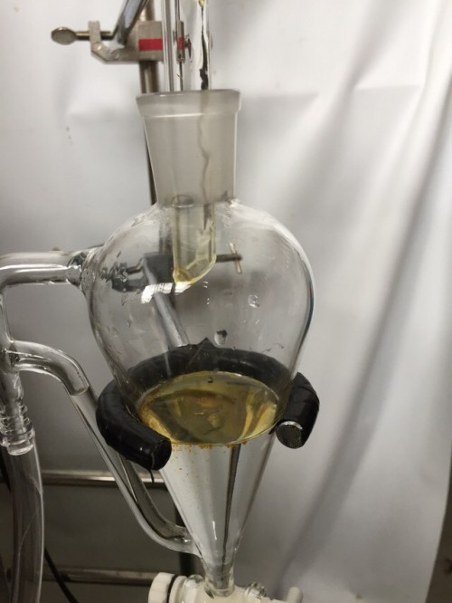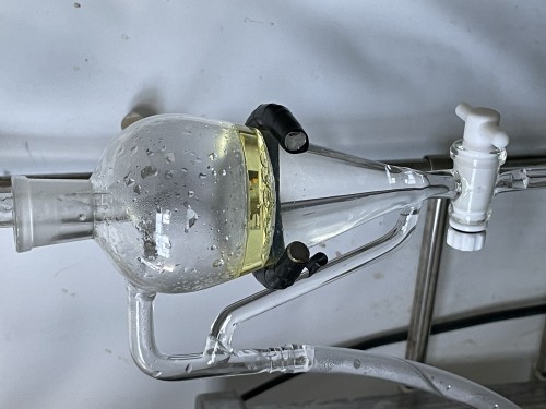 ドライのホーリーバジルの蒸留。材料自身の香りは強かった。茎部分が多い。抽出率はそう高くないが香りは良い。