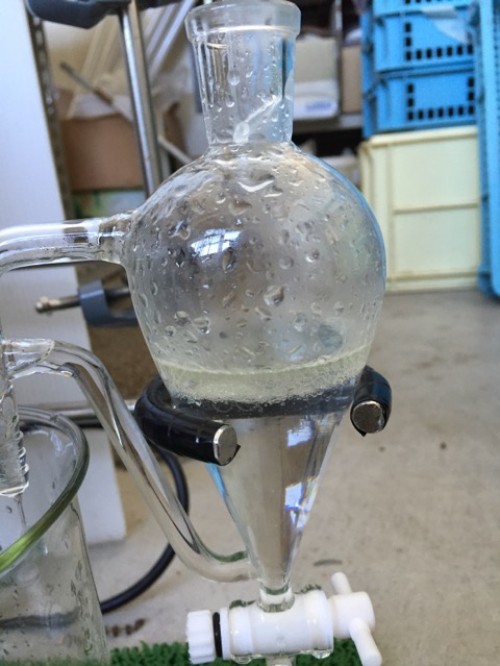 ホーリーバジル(トゥルシー)の蒸留です。ホーリーバジル(トゥルシー)は最近人気のハーブで、インドのアーユルヴェーダでは「不老不死の霊薬」とされ、また、ガパオ等のタイ料理にも使われていることで知っている方も多いと思います。スパイシーな刺激の中にミントの様な清涼感のある香りと「リナロール」の心をリラックスさせる効果があるとされるハーブです。今回はドライ。抽出率2.31%なかなかの抽出率です。蒸留時間120分。