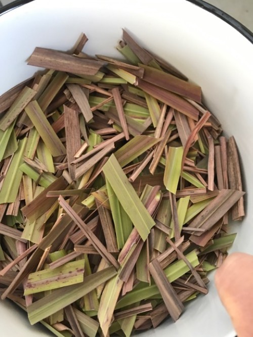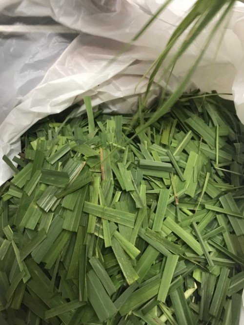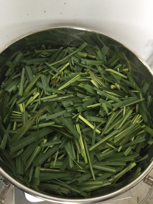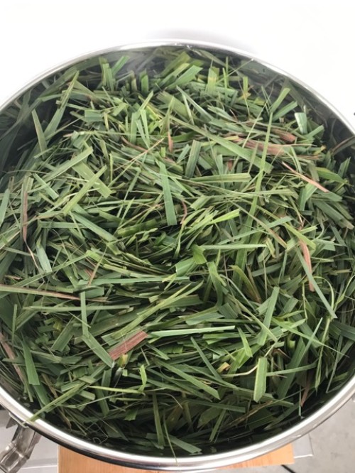 レモングラス葉先(フレッシュ)を蒸留。3~5cmにハサミでカットし蒸留。香りも良く全草より抽出率は高かった。