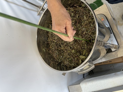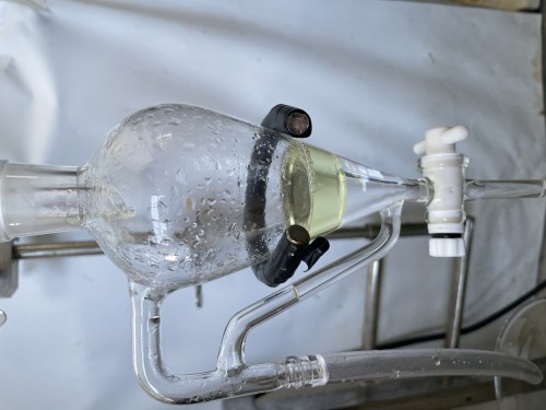 前日にレモングラス到着。前処理で5、6cmにカットして蒸留釜へ。今回3.5kg入れたが 最大4kgほどは入りそう。オイル13ml抽出率0.37%。事前に36L購入で蒸留されていた時よりも黄河で蒸留した時の方がオイルがとれている。(自分たちでは8ml程度)カット方法とネットに入れた材料と鍋の隙間が原因か?香りは同じ。レモングラスの良い香り。