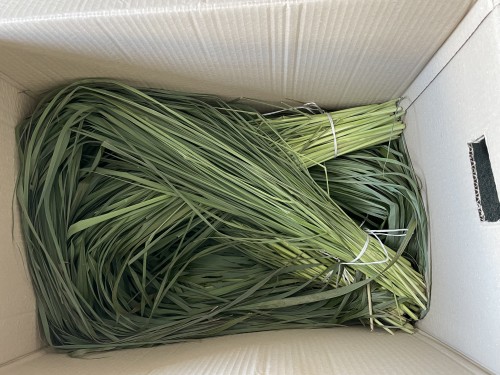 レモングラス(フレッシュ)の蒸留。きれいに束ねて送られてきた。茎部分もあり。4,5cmにカットしてから蒸留釜へ。送られてきた全量を釜に入れたが、若干詰め込み過ぎな感じはあり。なかなか蒸気穴をあけれないくらい詰まっている。4kg~4.5kgくらいが適量か。精油は良くとれている。香りも良い。