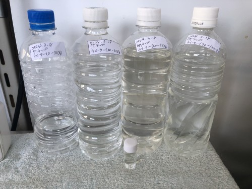 タケを粉砕したもの。オイル無。蒸留水蒸留直後は透明だったが、翌日見ると②~④は色が付いていた。蒸留時間120分。加水6L。