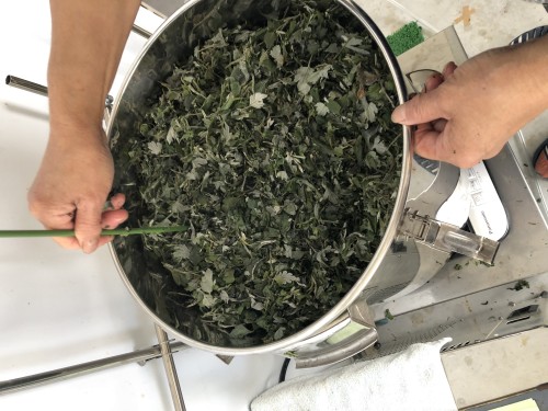 ホーリーバジル花・葉(フレッシュ)茎はあまり入らない花穂と葉のみ。この量で36L釜ちょうどいっぱいになるくらい。香り良い。精油もよく取れている。蒸留時間120分。加水6L。