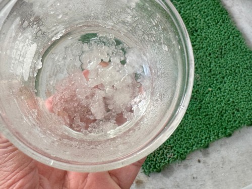 黄河のローズマリー。出来るだけ枝になっている部分は除いて葉を多く入れた。今回2420gで36L釜の8割程度。同じ状態のもので3kgくらいは入りそう。蒸留開始後60分位のところで冷却器に結晶が詰まっていた。冷却水を止め熱い蒸気を流して一旦は結晶がオイルセパレーターへ流れていったが、再開後 また詰まっていた。ビーカーに結晶のまま落とし取り分けた。結晶になっているものは、1.8シネオールの香りがつよい。樟脳(カンファー)の結晶とは香りが違う。蒸留時間120分。加水6L