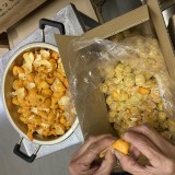 熟れた大和橘小さい実。全体量6,885g 果実4,520g 果皮のみ2,365g 皮を手で剥いてから果皮のみ蒸留。 1名で1時間40分 フードプロセッサーで粉砕4回し蒸留釜へ。加水15.5L 精油もしっかりとれた