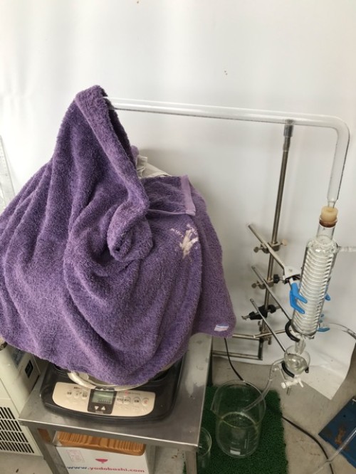 前日にチッパーでカットしたユーカリをスチーム蒸留。。蒸留前の材料自身には香りは特になかったが、材料をカットする時にはユーカリのスーッとした香があるという事。精油も採取できた。ミント系の甘く後からスーッとした香がする。ウォーターは1番(0~30分)までは良い。材料が細かいので布ネット使用。加水6L。蒸留時間120分。