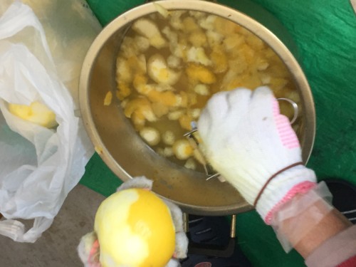 全体量7310g 果皮のみ800g ピーラーで皮むき1名55分。皮をむく時に出るオイルも無駄なく採取するため 水を張った容器の上で皮をむきます。剥き終わったら、その水も加水に加える。果皮のみフードプロセッサーで粉砕して蒸留釜へ。この材料では果皮のみあと3~4倍程度入る。加水15L。蒸留時間120分