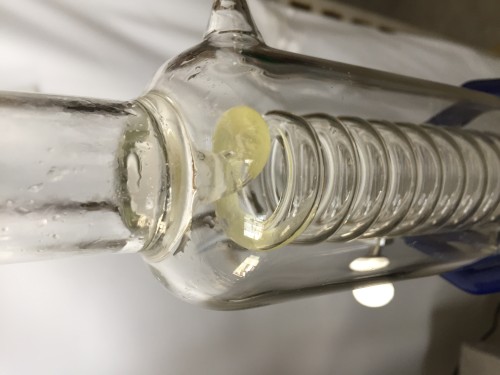 黄河のローズマリー。茂り過ぎていたものを刈り込み作業。花付きの時期。4,5cmにカットしてから蒸留釜へ。カンファーが多く含まれているせいか精油が冷却器に詰まっている。蒸留終了後 冷却せずに熱い蒸気をだして精油を流した。スチーム蒸留。加水6L
