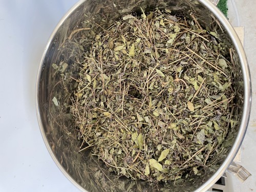 ホーリーバジル(ドライ)購入品か?葉、茎部分が多い。香りは強い。1000g 36L釜8割程度の量。15ml黄色いオイル。抽出率1.5% 香りは良い。花穂があるともっと甘い香りになるかも。