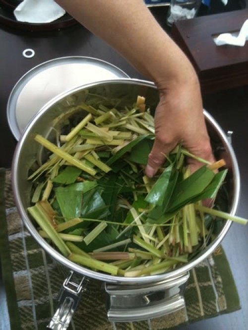 月桃の葉の蒸留。ハサミで4、5cmくらいにカットしてから蒸留釜へ。36L釜満タン入れた。45mlオイルセパレーター使用。