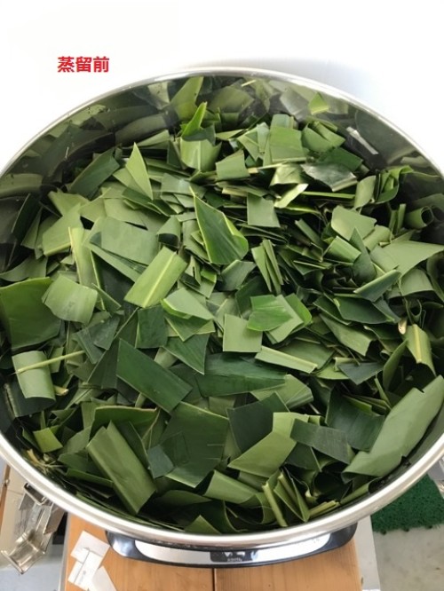 月桃の葉フレッシュの蒸留。3箱届いたが全部入れられた。3kg位までは入りそう。葉を4,5cm程度にカットしてから蒸留釜へ。葉をカットするといい香りがする。精油7mlとれた。