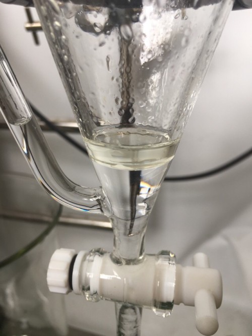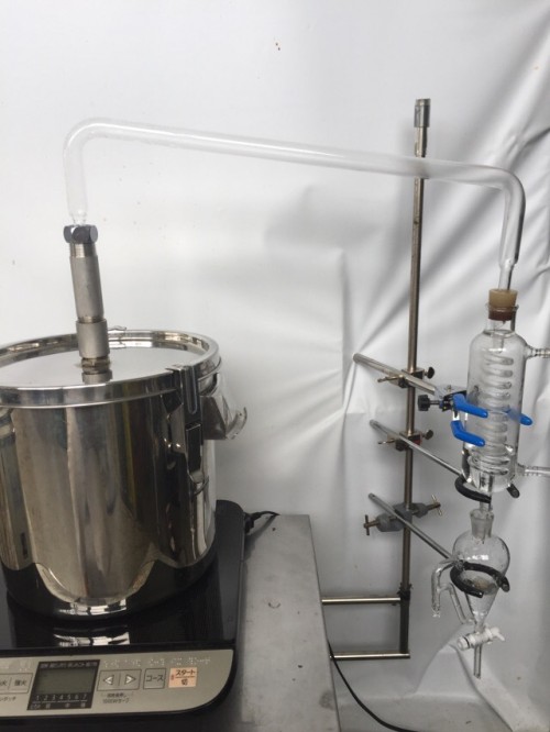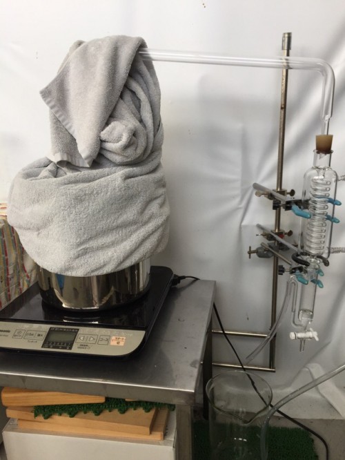 月桃の葉(フレッシュ)の蒸留です。スチーム蒸留 加水は 6 L 。月桃は精油が少ないので新商品の45mlロングオイルセパレーターを使用しました。寒くなってきたため連結管のところまで保温用のタオルをかけました。5kgの月桃からわずか3mlの精油 とても貴重な精油です。ウォーターは濃厚な香りです。
