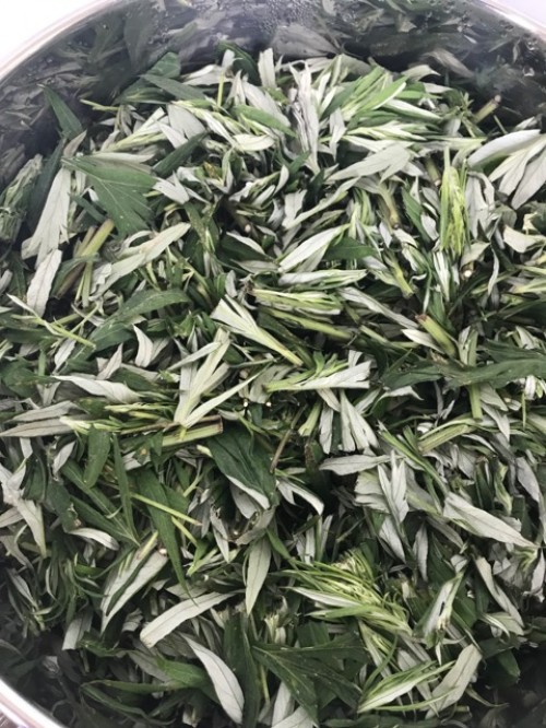 ヨモギ(フレッシュ)の蒸留です。ハサミで3~5cmにカットしてスチーム蒸留。ヨモギは抽出率が低いのでロングオイルセパレーターを使用。。うすいブルーの精油が採れました。香りはスーッとした香りです。加水6.5L。蒸留時間90分。