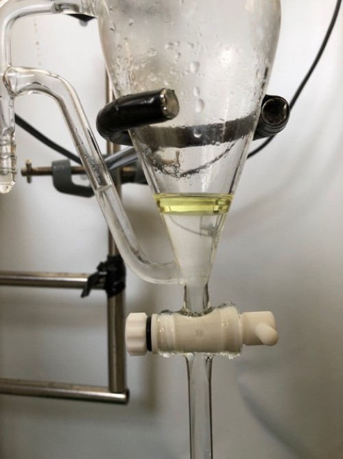蒸留時間120分。加水6.5L。冷凍のサンショウの軸のみの蒸留。布ネット使用。昨年6月に行った時と同じ材料だが収率が下がった。0.85%→平均0.34%。冷凍保存6か月が要因か。
