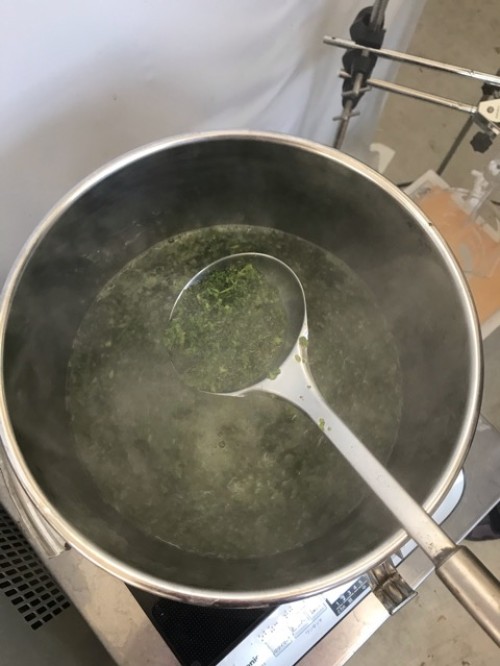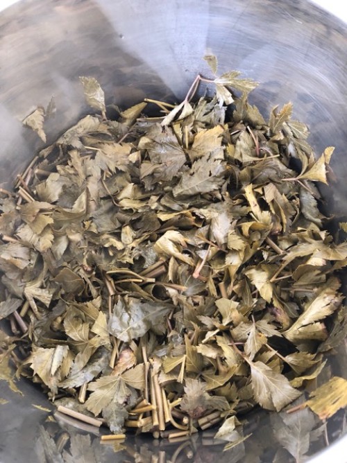 山椒の軸(冷凍)のみの蒸留。小分けパウチ冷凍で黄河へ。圧縮されている為 袋から出すと広がって実よりもカサがあるので7.9kgで釜いっぱい。布ネット使用。
