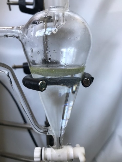 収穫後少し乾燥させて冷凍したシソの葉。届いたときは葉が変色しているものが多かった。45mlオイルセパレーター使用。精油思った以上にとれている。少し乾燥させていたのが余分な水分が取れて収率アップにつながったのか。香りも良い。