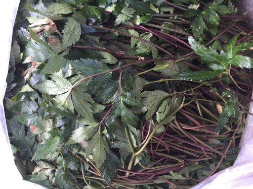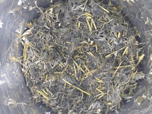 当帰トウキ(生)の蒸留。ハサミでカットし25L鍋で蒸留を行った。セロリの様な強い香り。精油も採れました。加水5.5L。蒸留時間120分。
