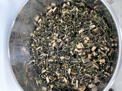 枝より葉が多いほとんど葉。今回のはドライになっていたので精油がとんんでいる可能性もあるが抽出率はよい。加水3.5L。蒸留時間120分。