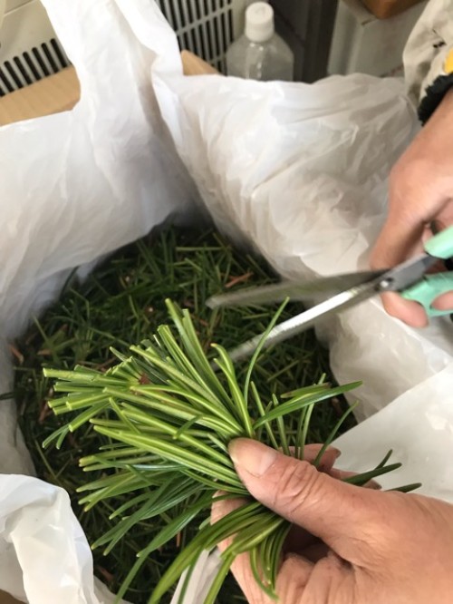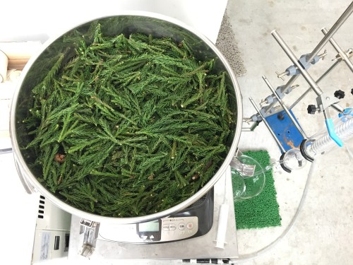コウヤマキの枝葉をハサミで4~5cmにカットして蒸留。加水6L。蒸留時間120分。
