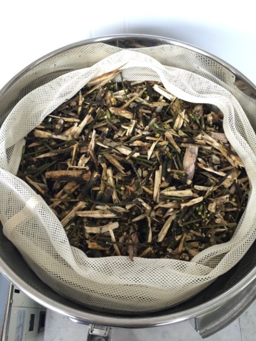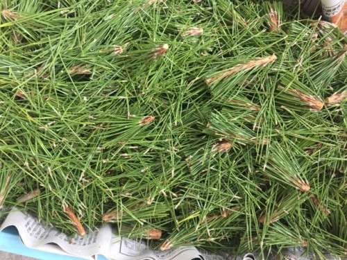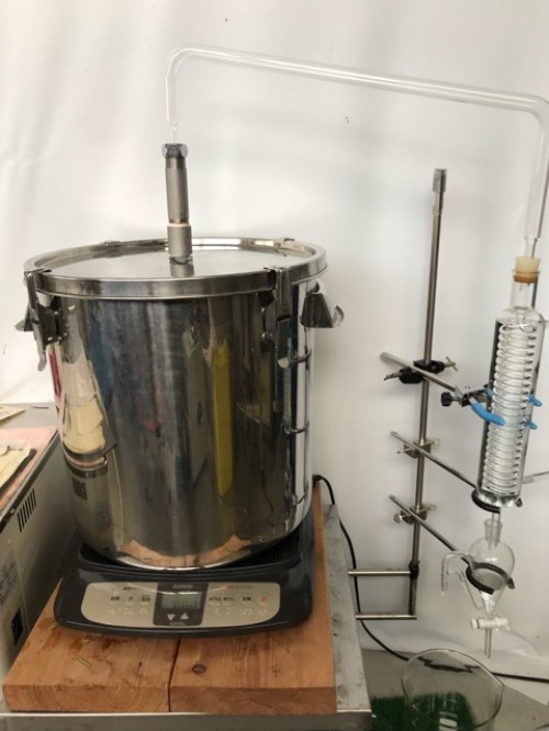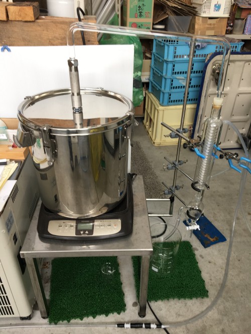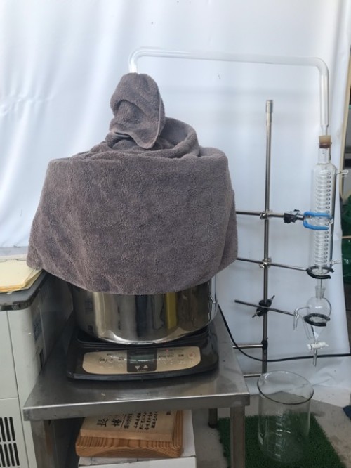 はさみで4~5cmにカットしてから蒸留。スギ花粉の時期だが、精油の香りはとても良い香り。加水6L。蒸留時間120分。