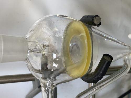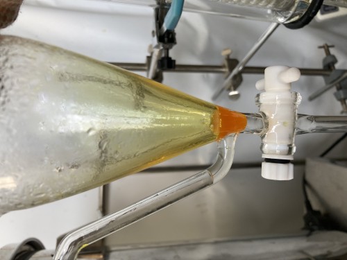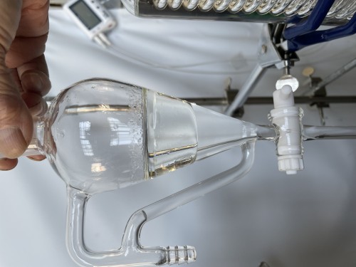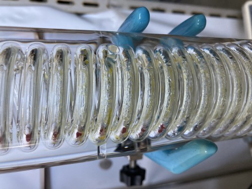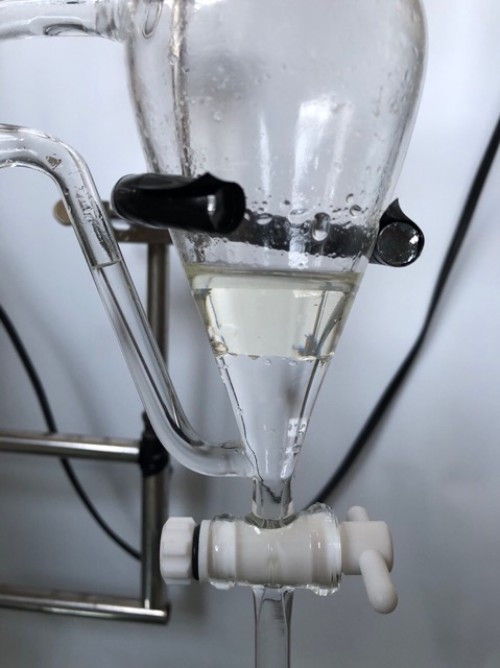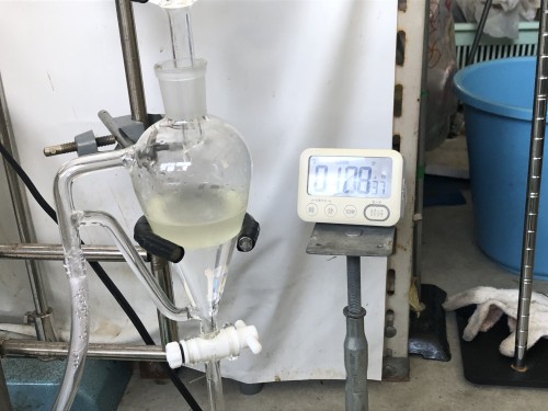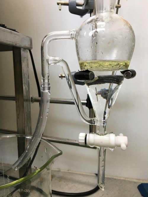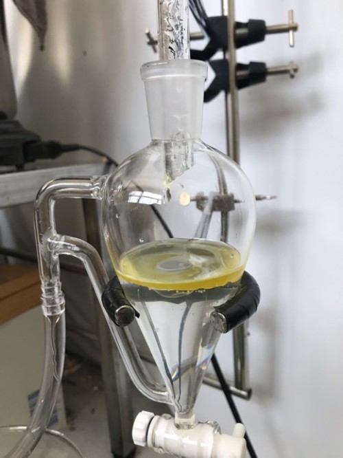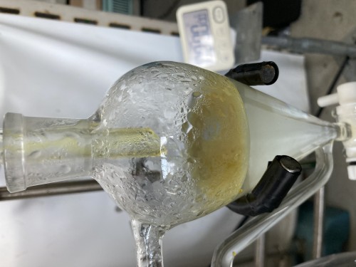 漆器のカンナクズ(ケヤキ)。黄色いオイル?冷却器にくっつく。最後冷却を止めて冷却器についているオイル?を流した。粘性強い、ウォーターも黄色く色がついている。とれたものは、オイル?オイル・蒸留水分析へ