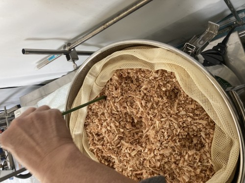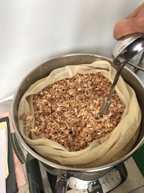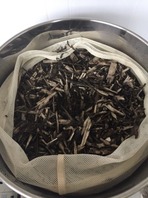 スギチップを布ネットにいれて36L蒸留釜へ入れる。樹木系は少しづつオイルがたまっていくので今回は180分蒸留しました。やや粘性のある黄色いオイルが採れました。加水6L。