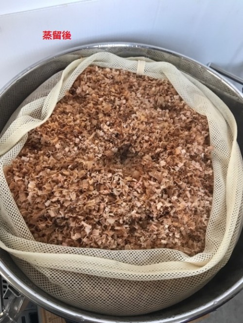 オガコよりも荒い削り片。材料は香り良い。蒸留直後の精油はやや蒸留臭がある感じ。寝かせると香りが落ちついていく。