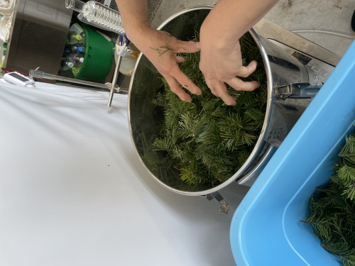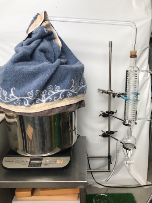 加水6.5L。北海道のトドマツの葉小枝 15kg送付。 カットしてあったが ハサミで4,5cm程度にカットしてから蒸留釜へ。棒などで蒸気の通り道を作ってあげる。オイルが少しずつ増えるため150分蒸留実施。さわやかな香り。1%以上採れた。香りが落ち着くと良い香りになりそう。