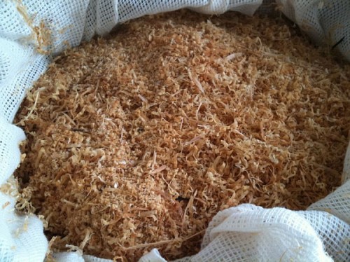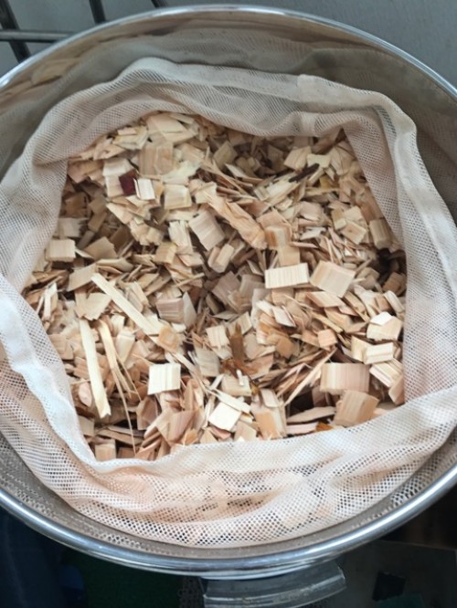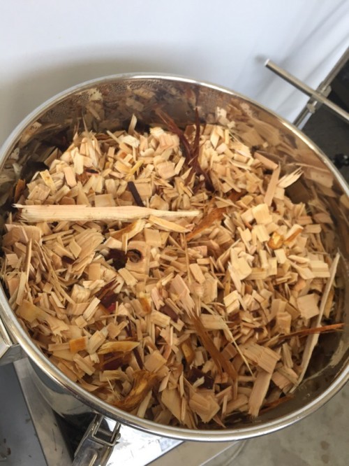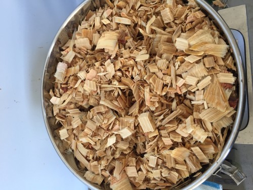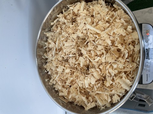 ヒノキチップ(2,3cm程)ほど。満タン入れて5.9kg。完全に乾燥はしていなかったが抽出率としてはそう高くない。