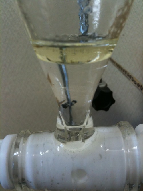 1cm角のスギキューブを蒸留。木部なので2時間半蒸留。加水6L。色のついた粘性のある精油が採れた。