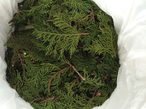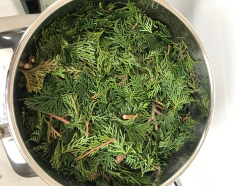 ヒノキの葉、小枝を蒸留しました。樹木系は材料をカットしてから蒸留釜に入れます。寒い時期は蒸留釜をバスタオルなどで巻いて保温すると蒸気が上がりやすくなり効率よく抽出することができます。加水6L。蒸留時間150分。