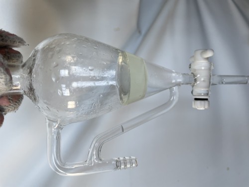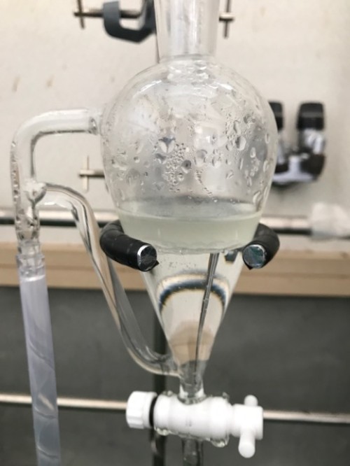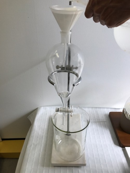 6/14(月)に黄河着。袋の外まで樟脳の香りがする。4日前にとってきたクスノキチップ。布ネット使用。直管冷却器+1L丸フラスコで二次冷却。一旦60分で丸フラスコにたまった蒸留水を分液ロートにかけ結晶を濾過する。蒸留時間100分。終了後丸フラスコ内の蒸留水と結晶を濾過する作業。丸フラスコのふちに結晶が付着しているのをフラスコをまわすと結晶がくっついて固まりとなってはがれていく。結晶だけを取り出し、ろ紙に挟んで水分をとる。