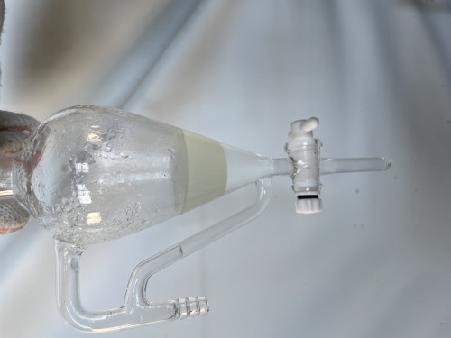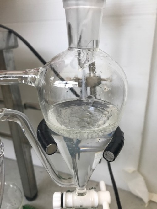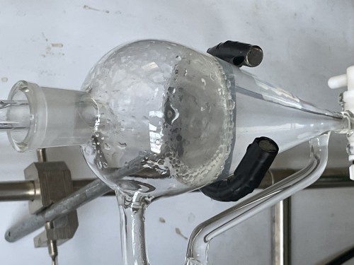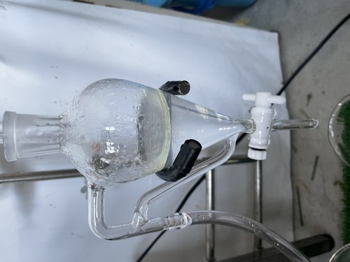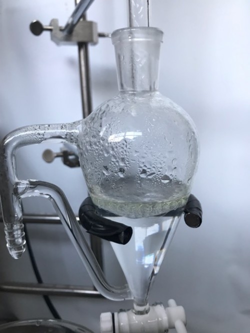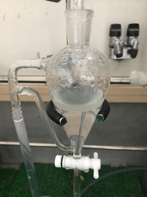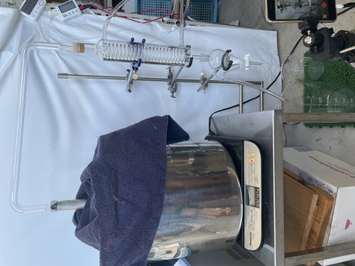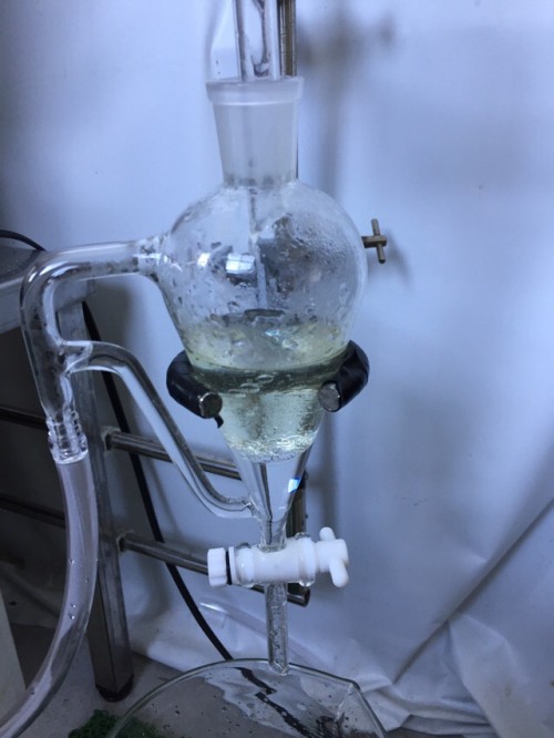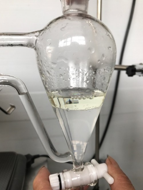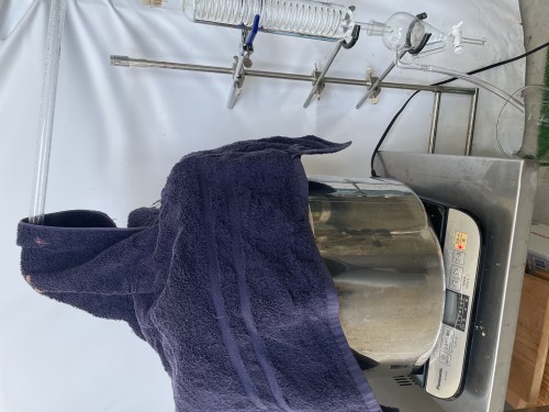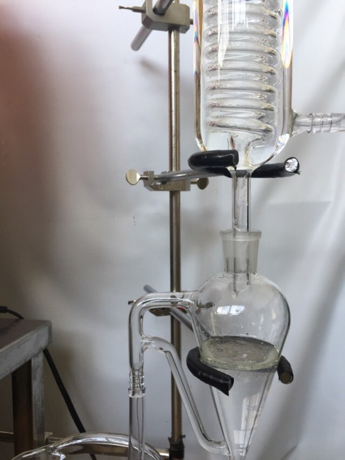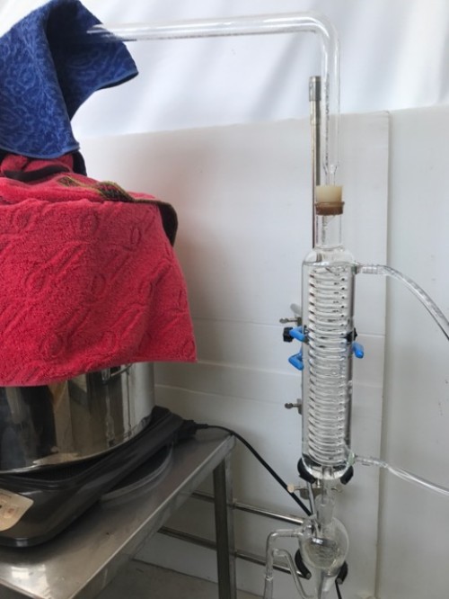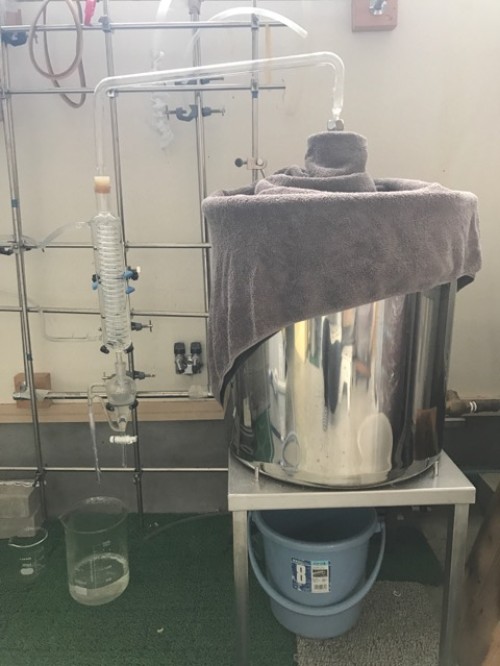 クスノキチップの蒸留。新鮮なのか送られてきた時からカンファーの香りがとても強かった。クスノキは、結晶化するので通常の蛇管式の冷却器ではなく直管の冷却器を使用する。直管冷却器を1L丸フラスコで受けて後からロートで結晶を濾過し分液ロートに蒸留水を分ける。濾過した結晶は紙にはさんで水分を取り除き結晶を取り分ける。結晶が多く直管冷却器の中にも結晶が溜まっていくので、冷却水は流さないで丸フラスコを冷やす。加水6.5L。蒸留時間90分。