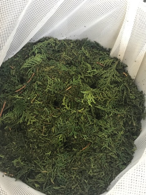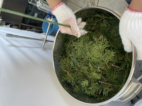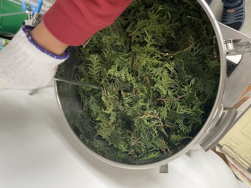 ヒノキの葉(フレッシュ)をスチーム蒸留。太い枝などはぬけて 葉をハサミで4~5cmにカットして蒸留釜に入れる。 釜の上部ををバスタオルなどで保温すると蒸気が連結管へ上がりやすくなり蒸留水が効率よく採れる。加水4L。蒸留時間120分。