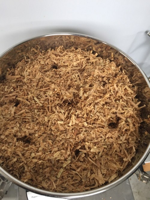 古代ヒノキのオガクズ多少小さいチップも入っている。香り強い。しっとりしているので乾燥までは仕切っていない状態。30分でもすでにオイルがたくさん採れて1時間弱でいったんオイルを取り分けた。そのあともオイルが出続け150分まで蒸留した。ウォーターも香りが強く良い香り。