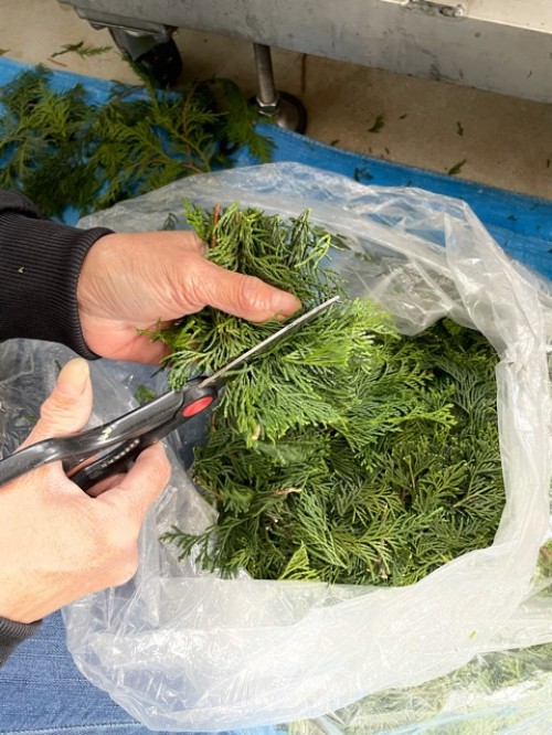 ヒノキ葉、小枝の蒸留。大型カッターで5、6cm程度にカットしてから蒸留釜へ。今回2875gで、釜ふんわり8分目程度。3kg~3.5kgまでは入りそう。