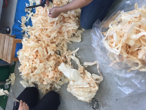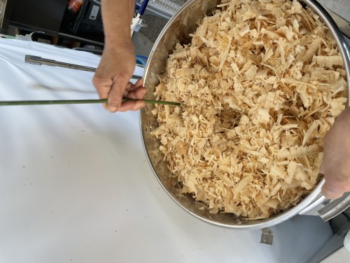 木工所より廃棄するヒノキカンナクズをもらって蒸留。木材を削ったそのままの状態。パリパリで大きい。ハサミでカットしてから蒸留釜へ。かさばるのでたくさん入らない。ヒノキの香りはする。