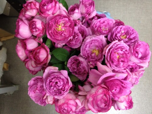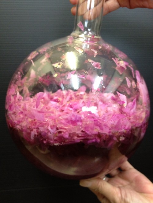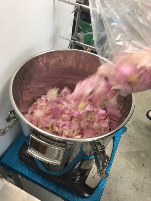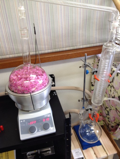 減圧煮出し蒸留。とても良い香り。バラのガクは入れないで花びらだけを採って蒸留釜へ。