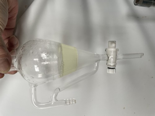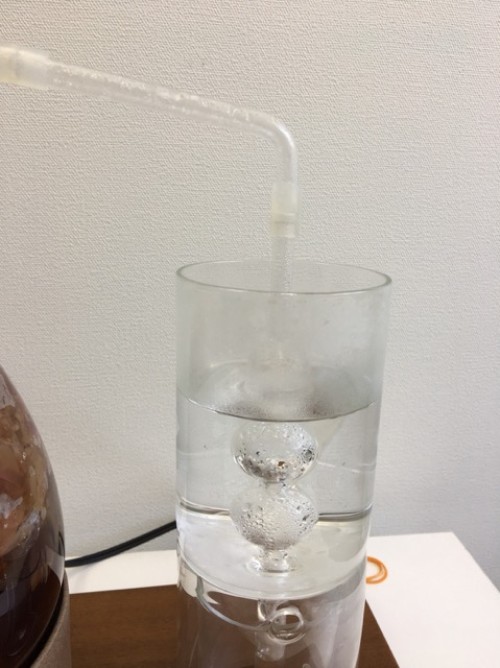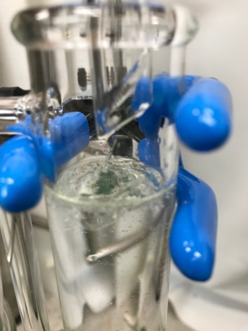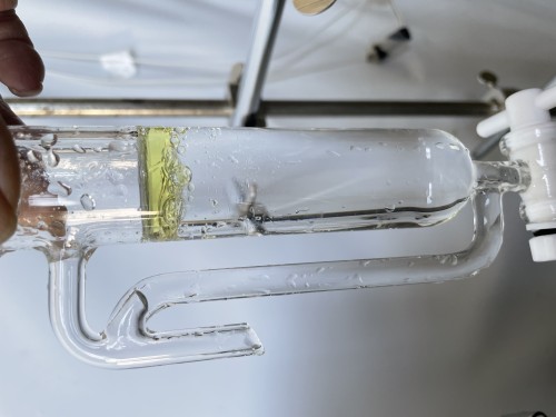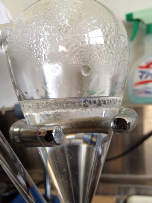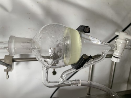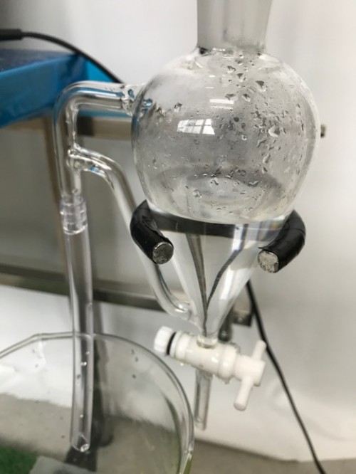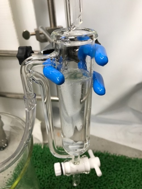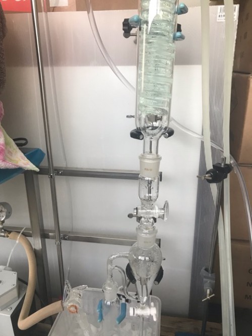 樟脳(クスノキ)の蒸留。4時間。二次冷却槽をガラスで作成。ガラス冷却槽の水位など様子を見ながら実施。2時間まではそのまま続けて実施。徐々に結晶もガラスフタ部分に付着してきた。一旦、2時間経過時にガラス冷却槽を交換し新しいガラス冷却槽と125mlオイルセパレーターを接続し再開実施。3時間経過あたりからまだ結晶が出ていてオイルセパレーターが詰まり 別のオイルセパレーターに交換して4時間まで蒸留した。まだ結晶も有りオイルも少量有りでシャーベット状になった。0~2時間で結晶29.5g。2~4時間でオイル(結晶含むシャーベット状)10mlとれた。0~4時間の抽出率0.61% この後もさらに5時間実施した。9時間total全体で 結晶+オイル44 抽出率0.68%