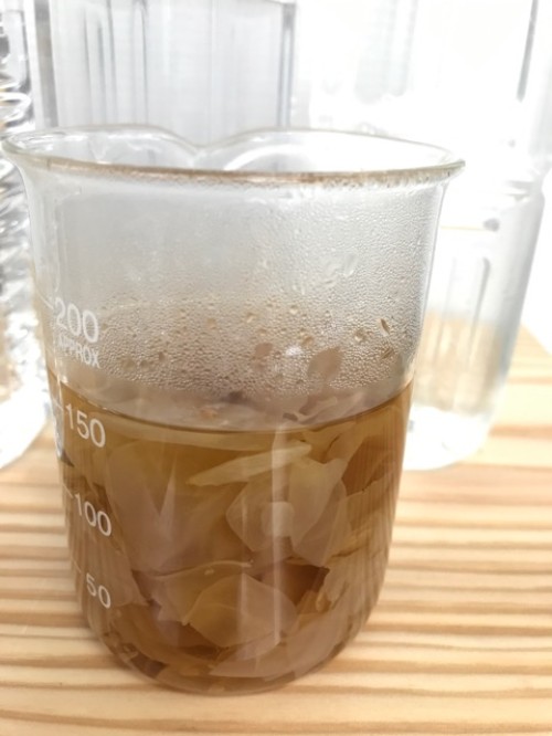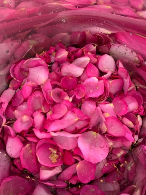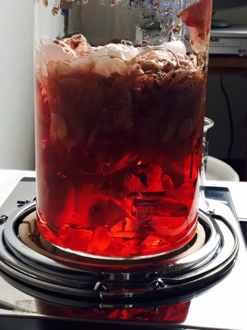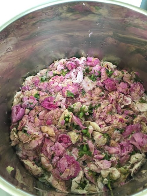 冷凍でとっておいたローズの花びらをPureStiller mini で煮出し蒸留。袋から出した時も良い香りがしていました。今回は銅ウールも使用し蒸留。ローズウォーターが採れました。加水 850ml。