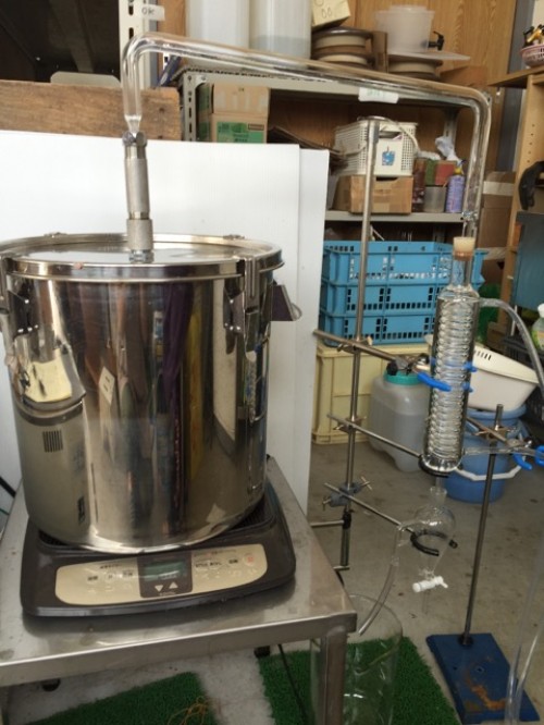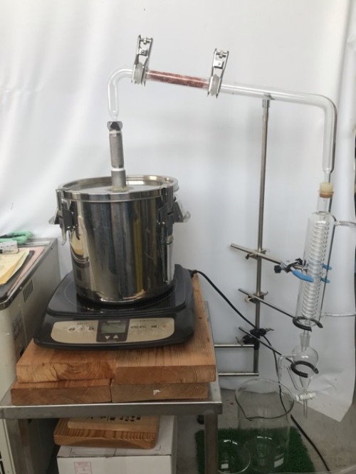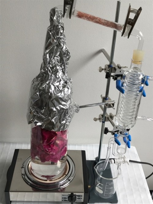 ダマスクローズ(冷凍)の蒸留です。ローズの精油にはローズオットーとローズアブソリュートがあり、水蒸気蒸留で採れる精油をオットー、溶剤抽出で採れる精油をアブソリュートと言います。ローズオットーの抽出率は約0.004%程度と言われ小型の蒸留器では精油を採る事はできませんが、ローズウォーターは採る事が出来ます。ローズウォーターの主成分は水に溶けやすいフェニルエチルアルコールでバラの香りの源でもあるためとても良い香りです。蒸留直後より少し寝かせると香りが落ち着き良い香りへとなっていきます。