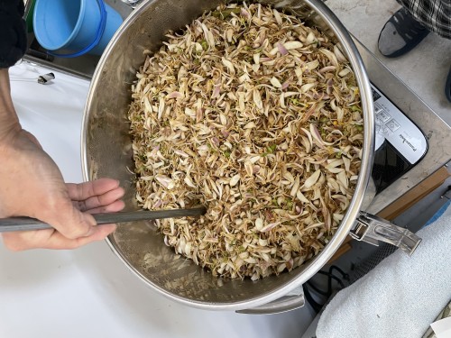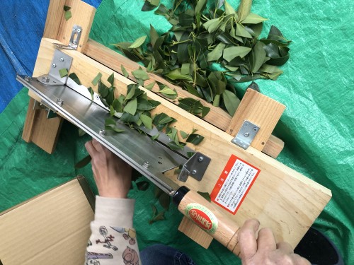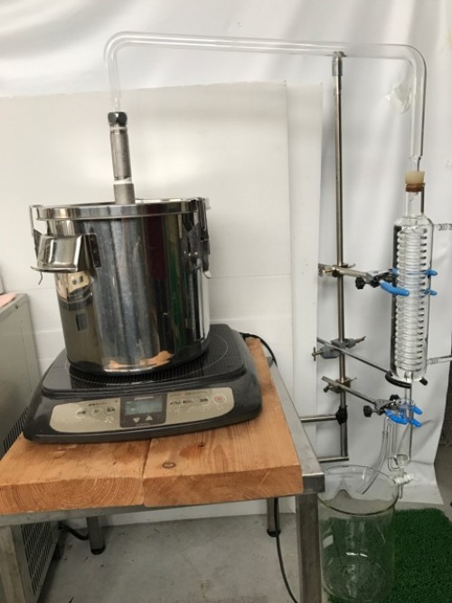 シキミの葉の蒸留。葉は、ハサミで4,5cmにカットしてから蒸留釜へ。精油もとれている。