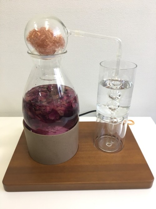 減圧蒸留装置を用いることによって、常圧(大気圧)では100℃で沸騰する水が約40~50℃で沸騰します。 花の香り(ダマスク・モダンの香り)が劣化することなく、ローズウォーターで再現できました!