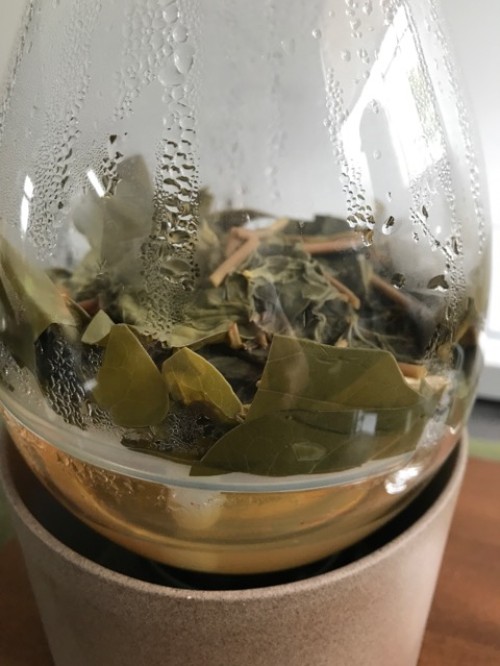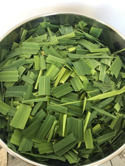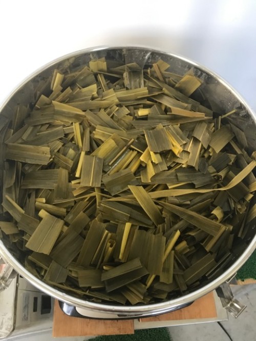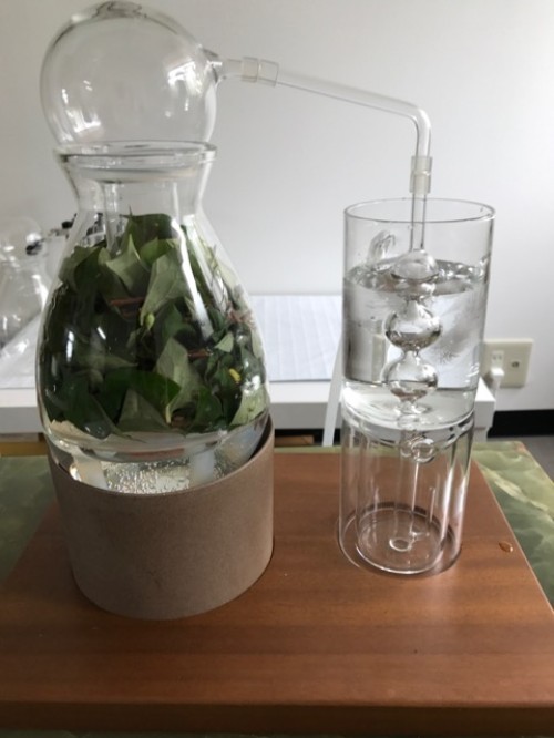 葉をハサミでカットしてからスチーム蒸留をしました。オイルはありませんでしたが蒸留水は杏仁豆腐の様な香りがしました。